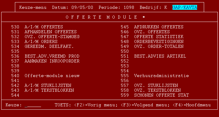 Menukeuze's 540 (Offerte-module nieuw) en 555 (Verhuuradministratie) zijn apart verkrijgbare modulen en vallen buiten deze handleiding.