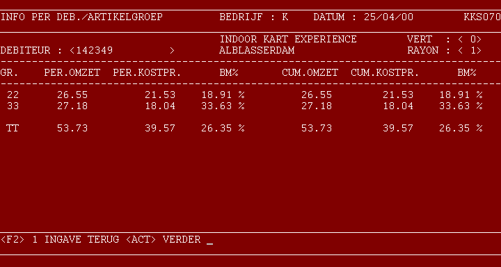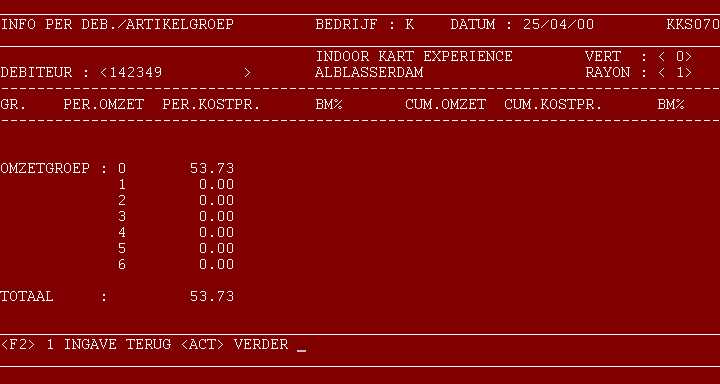 - Artikelgroep - Omzet deze periode - Kostprijswaarde van de omzet deze periode - Percentage bruto marge deze periode - Omzet cumulatief - Kostprijs cumulatief - Bruto marge cumulatiefDe bedragen en percentages worden ook getotaliseerd afgedrukt. Als laatste scherm wordt de omzet cumulatief voor de 7 omzetgroepen getoond.
