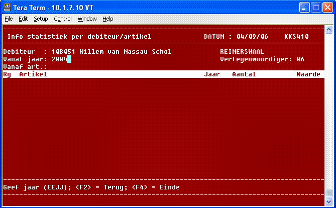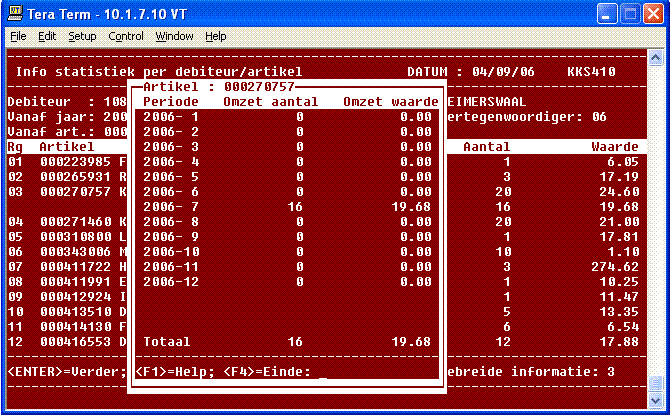 1 - Selectie Na het starten van programma 570 geeft u het debiteur- nummer in; zoeken is natuurlijk mogelijk. Naam en plaats van de debiteur worden getoond, evenals de bijbehorende vertegenwoordigerscode.Geef vervolgens in vanaf welk jaar u de statistische informatie wilt zien (Default is het huidige jaar). Daarna geeft u aan vanaf welk artikel u de gegevens wenst te bekijken. Ook hier is zoeken op de gebruikelijke manier mogelijk. 2 - Informatie De gewenste statistische gegevens verschijnen in het scherm, in maximaal 13 regels. U kunt doorbladeren met <ENTER> of terug naar de ingave van het artikelnummer met <F2>. Kies regel voor uitgebreide informatie: U kunt echter ook de getoonde informatie gespecificeerd per periode opvragen. Aan elk artikel wordt (ongeacht het aantal jaren waarvan de informatie wordt getoond) een regelnummer toegekend. Geeft u dit nummer in dan verschijnt een subscherm waarin de omzetaantallen en -bedragen van 1 jaar, per periode, van het zichtbaar worden. U kunt door de aanwezige jaren bladeren met de pijltjestoetsen: - omhoog voor een vorig jaar - omlaag voor een volgend jaar Met <F4> verlaat u dit 'window'.