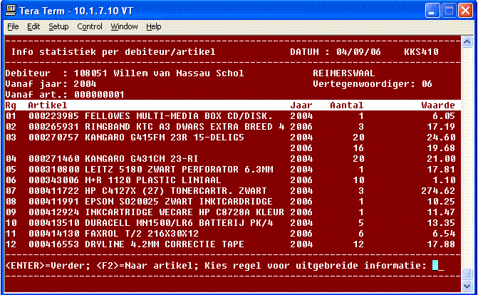 Programma 570 laat u van een debiteur zien welke artikelen deze in de loop der jaren heeft afgenomen. Wilt u van een bepaald artikel zien aan wie u dit in de afgelopen jaren heeft verkocht, kiest u dan voor programma 565 Info per artikel/debiteur.