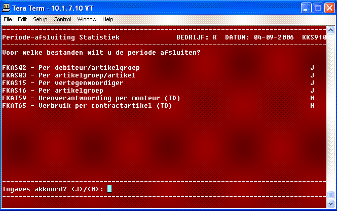 1 - Selectie Na het starten van programma 575 geeft u aan voor welke statistiek u de periode wilt afsluiten. U doet dat door het ingeven van J (of N) in de betreffende regels, zoals in het hierboven getoonde voorbeeld. De laatste twee genoemde bestanden zijn alleen van belang indien u de Technische Dienst-module gebruikt. Bevestig dat u de periode voor de gekozen statistieken wilt afsluiten: Ingaves akkoord? Op het scherm wordt gemeld welke statistieken worden afgesloten, daarna komt u terug in het menu van waaruit u programma 575 heeft gestart.