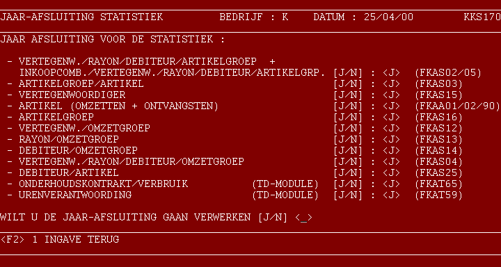 Werkwijze Controleer of u programma 560 al verwerkt heeft. Controleer of u, indien gewenst, een voorraadlijst met programma 417 heeft afgedrukt. Start dan pas programma 576. 1 - Selectie Bepaal voor welke statistiek u de periode wilt afsluiten. U kiest door het geven van J achter de betref- fende statistieken. Bevestig dat u het jaar voor de gekozen statistieken wilt afsluiten: WILT U DE JAAR-AFSLUITING GAAN VERWERKEN [J/N] Maak de gewenste keuze. Op het scherm wordt gemeld welke statistieken worden afgesloten, daarna komt u terug in het menu van waaruit u programma 576 heeft gestart.
