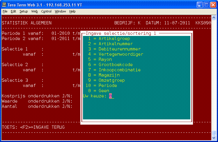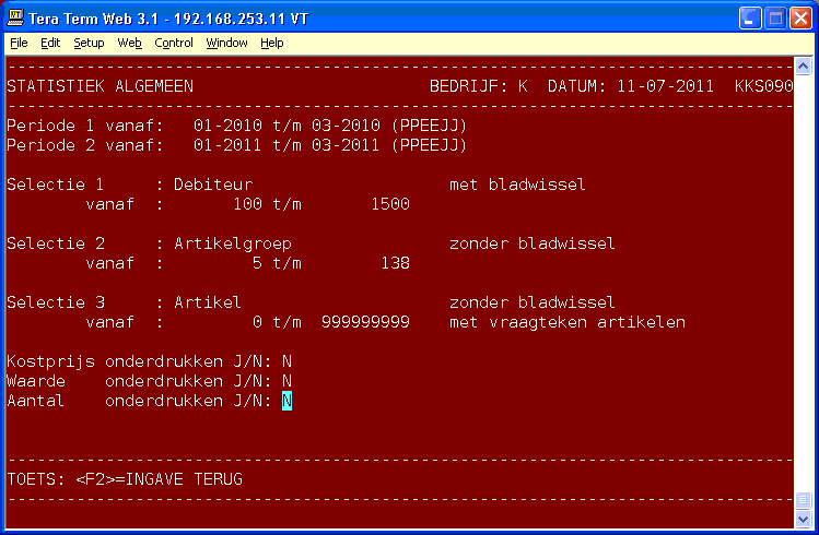 In dit programma kunnen 2 periodes geselecteerd worden, om bijvoorbeeld een bepaalde periode vorig jaar met de zelfde periode van dit jaar te kunnen vergelijken. De indeling stelt u zelf samen door te kiezen voor bepaalde selecties/sorteringen. Per selectie is het mogelijk om de kostprijs, de waarde en het aantal af te drukken.