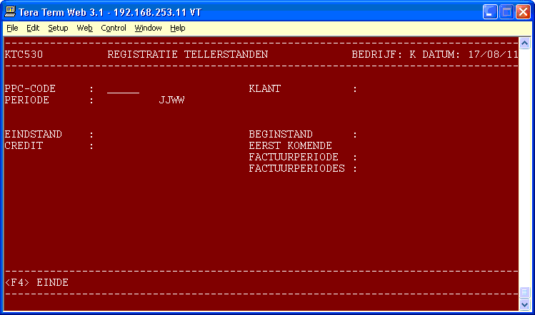 Werkwijze aanmaken Start programma 760. PPC-code Vul de PPC-kode van de machine waarvoor u de tellerstand wilt registreren en vervolgens de factuurperiode. Alle machines met een tellertikcontract moeten een PPC-code hebben. Eindstand U krijgt nu de eindstand te zien zoals die tot dit moment was. Geef de huidige eindstand in en ga verder bij de ingave van het aantal credittikken. U kunt toets <F1> gebruiken om aan te geven dat u de gegevens wilt verwijderen; na J op de vraag WEET U ZEKER DAT U DIT RECORD WILT VER- WIJDEREN? worden alle gegevens van de ingave verwijderd zodat de huidige eindstand op nul staat en keert het programma terug naar de rubriek PPC-code. Credittikken Geef eventueel een aantal voor credittikken in; de eindstand wordt hiermee verminderd; dit kan bijvoorbeeld nodig zijn als door het uitvoeren van tests door een monteur de tel- lerstand was verhoogd (deze hoeven niet in rekening te worden gebracht). Bevestiging Beantwoord de vraag INGAVE AKKOORD ? [J/N] Na J wordt de eindstand opgeslagen (eventueel verminderd met het aantal credit- tikken). Na N of <F4> breekt u de bewerking af; de eindstand wordt niet opgeslagen; het programma gaat terug naar de rubriek eind- stand. Met <F4> vanaf de rubriek ppc-code beëeindigt u programma 760, waarna u terugkomt in het keuzemenu.Beschrijving van de rubrieken