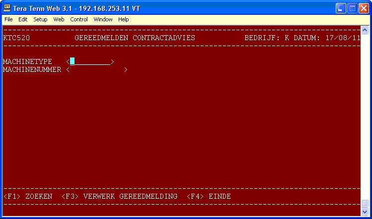 Werkwijze Start programma 765. Selectie Geef F3 als u alle contractadviezen wilt gereed- melden of geef een machinetype en -nummer in als u een contractadvies wilt verwijderen. Beantwoord na F3 de vraag: GEREEDMELDEN ADVIES VERWERKEN [J/N] Na J worden alle contractadviezen gereedgemeld en na N of <F2> gaat het programma terug naar de rubriek 'machinetype'. Beantwoord na ingave machinetype en -nummer de vraag: DE ADVIESREGEL VERWIJDEREN [J/N] Na J wordt het advies van de betreffende machine verwijderd en na N of <F2> wordt het advies niet verwijderd en gaat het programma terug naar de rubriek 'machinetype'. Vanaf de rubriek 'machinetype' verlaat u het programma met de <F4>-toets.