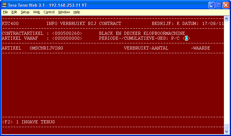 - Het nummer van het contractartikel (welke contractsoort); - Vanaf welk artikelnummer u de informatie over verbruik wilt zien; - Gegevens van alleen deze periode of cumulatief t/m deze periode.