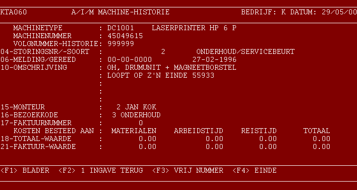 01 - Machinetype 9 A De code van een machinetype; moet zijn aangemaakt met programma 702 'A/I/M Machinetypes'. Achter het type staat de omschrijving. 02 - Machinenummer 12 A Een nummer waarmee de machine wordt aangeduid. Hoe- wel deze rubriek de naam machienummer draagt, mogen ook letters gebruikt worden. 03 - Volgnummer his- 6 N torie Een nummer dat door het programma wordt bepaald, het begint bij 999999 en loopt in volgorde af. 04 - Storingsnummer 6 N Het storingsnummer is vrij te bepalen. Normaal wordt dit echter toegekend door programma 732 'A/I/M Sto- ringen'. 05 - Storingsoort 3 N De storingsoort is bepaald met het trefwoord STORING met als toevoeging het nummer van de storingsoort. 06 - Datum DD-MM-EEJJ Datum waarop de storing is gemeld. 07 - Tijd 5 A Het tijdstip van de melding. 08 - Gereed DD-MM-EEJJ Datum waarop de storing is afgehandeld. 09 - Tijd 5 A Het tijdstip waarop de storing is afgehandeld. 10 - Omschrijving 5 x 35 A De verrichte werkzaamheden. De laatste regel wordt automatisch gevuld als de contractmodule in gebruik is met een mededeling die verband houdt met uitge- voerd onderhoud. 15 - Monteur 3 N het nummer van de monteur die de werkzaamheden heeft verricht. Moet zijn aangemaakt met programma 700 'A/I/M Monteurs'. 16 - Bezoekcode 2 N Moet voorkomen onder het trefwoord BEZOEK. 17 - Factuurnummer 8 N Het nummer van de factuur waarmee de kosten zijn doorberekend. 18 - 20 Totaalwaarden van de kosten (worden ingevuld door programma 737 'Gereedmelden factuuradvies') 18 - Materialen 6 D 2 19 - Arbeidstijd 6 D 2 20 - Reistijd 6 D 2 21 - 23 Factuurwaarden van de kosten (worden ingevuld door programma 737 'Gereedmelden factuuradvies') 21 - Materialen 6 D 2 22 - Arbeidstijd 6 D 2 23 - Reistijd 6 D 2