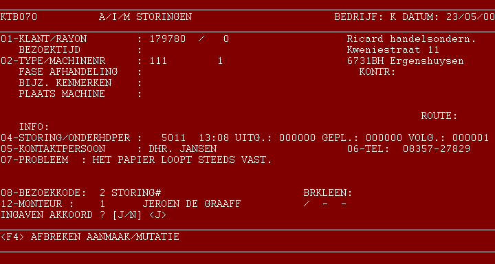- Alsnog machinegegevens aanmaken met het nummer van de machine van deze klant met programma 703 'A/I/M Machines' als dit tenminste nog niet was gebeurd; - De storingsgegevens aanvullen met het machinenummer met programma 744 'Overboeken storing'.