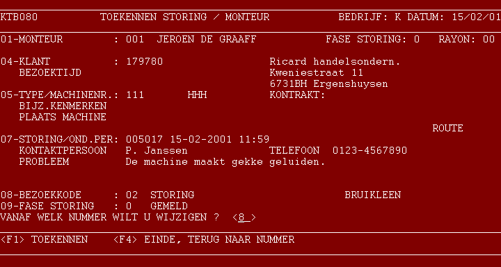 1) Het toekennen van een storing aan een monteur na programma 732 (A/I/M Storing); 2) Het 'parkeren' van een storing: het toekennen van een andere fase (2 t/m 7), bij voorbeeld 'wacht op onderdelen'; 3) het afmelden van een storing door een fase (2 t/m 7) in te voeren waarmee u aangeeft dat de storing is afgehandeld.Machinetype