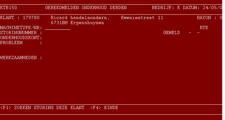 Werkwijze aanmaken Start programma 734. Gegevens Geef klantnummer, machinetype, -nummer en storings- nummer van een storing die is geregistreerd als uit te voeren door derden of start bij één van deze rubrieken een zoekprocedure met toets <F1>. Bevestiging Beantwoord de vraag: WILT U DE STORING GEREEDMELDEN ? [J/N] Maak de gewenste keuze. Met N keert u terug naar de rubriek klantnummer. Omschrijving Geef de omschrijving van de verrichte werkzaamheden in; als u niet alle regels invult, afsluiten met toets <F4>. Bevestiging Beantwoord de vraag: INGAVEN AKKOORD ? [J/N] Na J of <F4> is de storing afgehandeld en wordt zij in de historie opgenomen. Na N de werkzaamheden opnieuw invullen. Met <F4> vanaf de rubriek klantnummer beëindigt u programma 734, waarna u terugkomt in het keuzemenu.