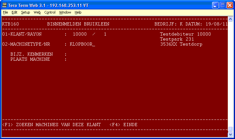 Werkwijze aanmaken Start programma 735. Gegevens Geef klantnummer, machinetype, -nummer van de bruikleenmachine. Op ieder van deze velden kunt u zoeken met toets <F1>. Het programma laat dan een scherm zien met de aanwezige gegevens. Kies het gewenste volgnummer. Bevestiging Beantwoord de vraag: INGAVEN AKKOORD ? [J/N] Na J is de bruikleenmachine weer beschikbaar. Na N of <F4> blijft de registratie gehand- haafd. Met <F4> vanaf de rubriek klantnummer beëindigt u programma 735, waarna u terugkomt in het keuzemenu.