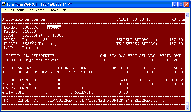 Werkwijze Start programma 502. 1 - Bonnummer Geef het bonnummer. U kunt direct het bonnummer ingeven, bladeren met <F3> of met <F1> naar het het veld debiteur gaan. 2 - Via bonnummer Als u direct het bonnummer ingeeft of bladert, worden de debiteurengegevens en de orderkop per bon op het scherm getoond. Bevestig als u de juiste bon gevonden heeft met <RETURN>, stop met <F2>, of blader verder met <F3>. 3 - Via debiteur en Wanneer u zoekt via het veld debiteur, kunt u order het debiteurennummer ingeven of een zoeksleutel. Daarna kunt u het ordernummer ingeven, of zoeken naar de orders voor deze debiteur. 4 - Afleverbon U kunt nu: - met <F1> een afleverbon aanmaken (af- drukken met programma 516). De order wordt hierdoor niet gereedgemeld. - met <F3> de bon gereedmelden. - met <I> informatie omtrent de order- regels opvragen. - direct de regel ingeven waarin u gegevens wilt wijzigen of welke u wilt laten vervallen: na het wijzigen van een regel heeft u weer alle keuzes tot uw beschikking. De gegevens die u kunt wijzigen zijn: - OMSCHRIJVINGEN - EENHEIDPRIJS - REGELKORTING - BTW-CODE - AANTAL TE LEVEREN (voor de betreffende bon) - AANTAL NIET LEVEREN - ORDERREFERENTIE Als het AANTAL NALEVEREN > 0 is, en u verlaagt dit aantal, zal het daardoor vervallen backorderdeel bij het AANTAL NIET LEVEREN geteld worden. Na de keuzes afleverbon, gereedmelden of <F4>.kunt u, indien zo ingesteld via het trefwoord ORDERETIKETTEN, het aantal af te drukken orderetiketten opgeven, waarna u terugkeert naar de ingave van het bonnummer.
