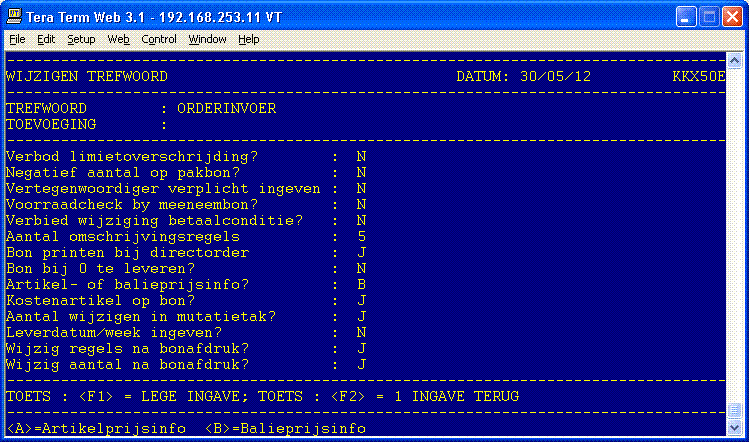 Trefwoord Rubriek Inhoud Omschrijving ORDERINVOER Toevoeging Geen Verbod limietoverschrijding? J Als bij orderingave de kredietlimiet van een klant wordt overschreden, kan men geen regels aan de order toevoegen,