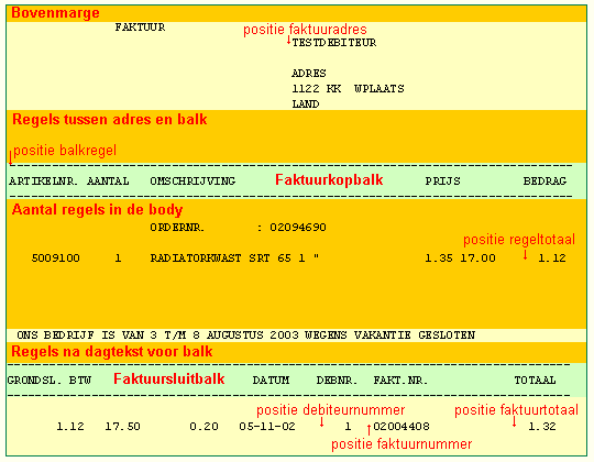 De body is het gedeelte na de kopbalk, waar de orderregels worden afgedrukt.Positie artikelnummer Positie omschrijving -1=Niet afdrukken Positie aantal -1=Niet afdrukken Positie stuksprijs -1=Niet afdrukken Positie kortings-% -1=Niet afdrukken Positie regeltotaal -1=Niet afdrukken Reservepositie body (1) niet in gebruik Reservepositie body (2) niet in gebruik Reservepositie body (3) niet in gebruik Reservepositie body (4) niet in gebruik Reservepositie body (5) niet in gebruik Positie '* = nalevering' Positie 'subtotaal' Voor de tekst subtotaal Positie bedrag subtotaal Voor het daadwerkelijke subtotaal Positie 'kredietbeperking' Voor de tekst kredietbeperking Positie bedrag kredietbeperking Positie 'BTW bedrag' Voor de tekst BTW-bedrag: Positie bedrag BTW Positie 'Debn./Factnr./Datum' Voor de betreffende tekst Positie Debn./Factnr./Datum Positie 'Factuurtotaal' Voor de betreffende tekst Positie factuurtotaal Positie 'Creditfactuur' Voor de betreffende tekst Positie Dagtekst Blanco regels voor vervolgblad Aantal regels tussen de orderregels en de tekst Vervolgblad Positie 'vervolgblad' Voor de betreffende tekst positie actieprijs-indicatie -1=Niet afdrukken