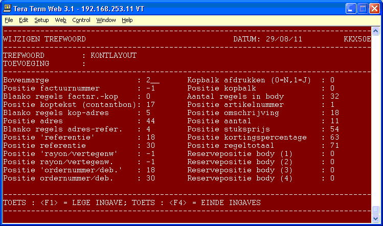 De body is het gedeelte na de kopbalk, waar de orderregels worden afgedrukt.Positie artikelnummer Positie omschrijving -1=Niet afdrukken Positie aantal -1=Niet afdrukken Positie stuksprijs -1=Niet afdrukken Positie kortings-% -1=Niet afdrukken Positie regeltotaal -1=Niet afdrukken Reservepositie body (1) niet in gebruik Reservepositie body (2) niet in gebruik Reservepositie body (3) niet in gebruik Reservepositie body (4) niet in gebruik Reservepositie body (5) niet in gebruik Positie '* = nalevering' Positie 'subtotaal' Voor de tekst subtotaal Positie bedrag subtotaal Voor het daadwerkelijke subtotaal Positie 'kredietbeperking' Voor de tekst kredietbeperking Positie bedrag kredietbeperking Positie 'BTW bedrag' Voor de tekst BTW-bedrag: Positie bedrag BTW Positie 'Debn./Factnr./Datum' Voor de betreffende tekst Positie Debn./Factnr./Datum Positie 'Factuurtotaal' Voor de betreffende tekst Positie factuurtotaal Positie 'Creditfactuur' Voor de betreffende tekst Positie Dagtekst Blanco regels voor vervolgblad Aantal regels tussen de orderregels en de tekst Vervolgblad Positie 'vervolgblad' Voor de betreffende tekst Korting afdrukken 0=Niet afdrukken