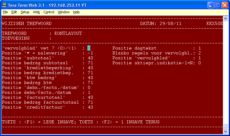 1=Op laatste regelAantal regels in body Positie afrekening deelfactuur Positie kredietbeperking Positie dagtekstregel Lege regels na dagtekst Sluittekst printen 0=Niet