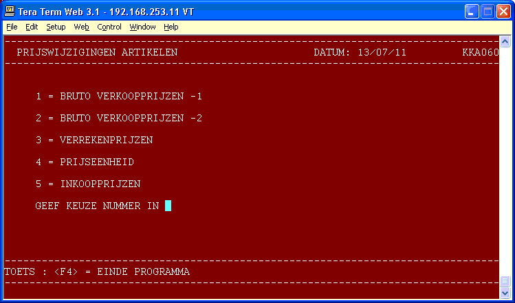 Met programma 404 kunt u de bruto-verkoopprijzen en de verrekenprijs wijzigen. U kunt op diverse wijzen selecteren. Van wijzigingen in de verrekenprijs en de prijseenheid wordt automatisch een mutatieverslag en een journaaloverzicht afgedrukt.