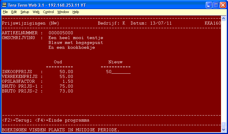 Met programma 405 kunt u per artikel de bruto verkoopprijzen, de inkoopprijs en de verrekenprijs per artikel wijzigen. Met programma 422 kunt u daarna een overzicht van de wijzigingen afdrukken.