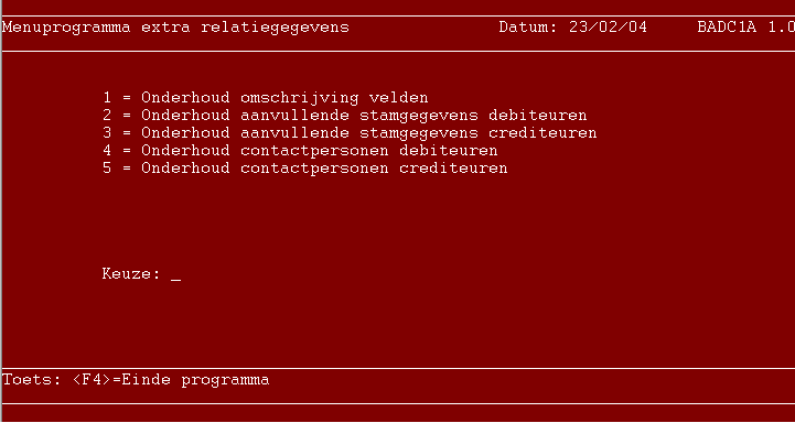 Werkwijze Start programma 601. 1 - Keuze Kies wat u wilt doen. Met optie 1 kunt u de rubrieken van de diverse schermen van een naam voorzien. Met optie 2 tot en met 5 kunt u de inhoud van de diverse schermen onderhouden. De opties 2 t/m 5 zijn ook beschikbaar in de meeste standaard- versies van A/I/M Debiteuren en A/I/M Crediteuren. Met de <F4>-toets kunt u dit programma beeindigen.