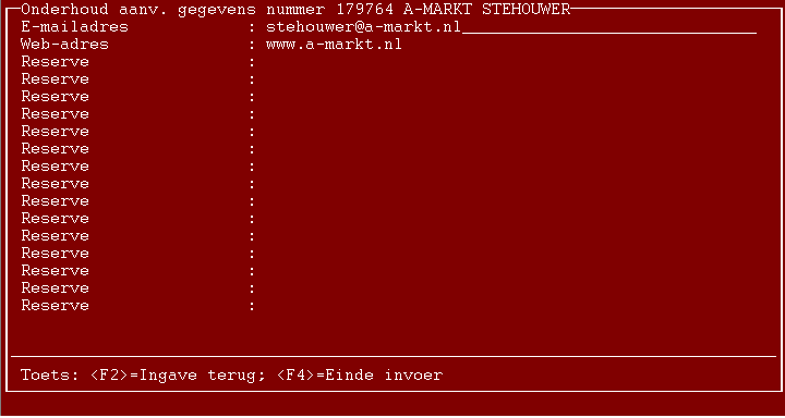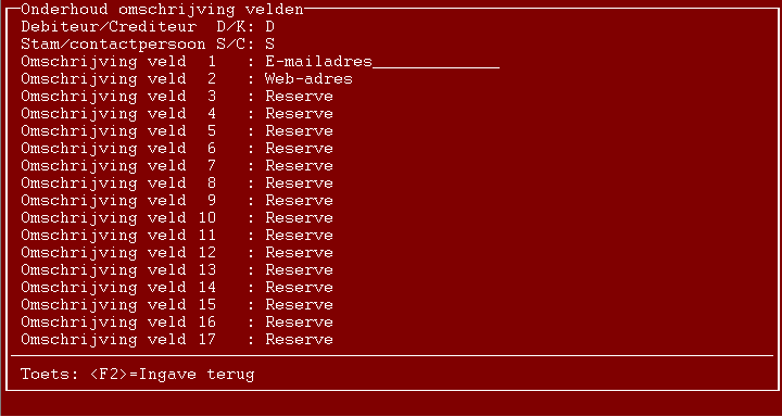 Iedere in te geven rubriek kan maximaal 50 tekens bevatten. De schermen bevatten initieel een groot aantal reserve-velden.