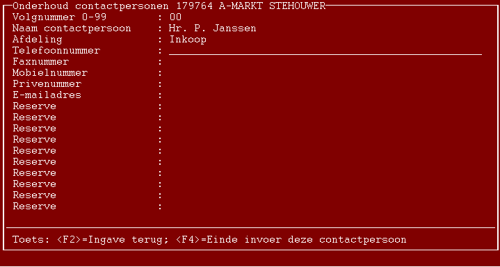 Onderhoud contactpersonen Werkwijze Start programma 601. 1 - Debiteur/Crediteur Kies voor optie 4 voor de contactpersonen bij debiteuren. Kies voor 5 voor het onderhouden van contapersonen bij crediteuren. 2 - Nummer Geef het nummer van de debiteur of crediteur in. U kunt natuurlijk ook zoeken op de bekende manier. 3 - Volgnummer Kies of zoek het volgnummer van de te behandelen contactpersoon. 4 - Rubrieken De aanwezige gegevens worden getoond, U kunt deze naar eigen inzicht wijzigen. Met de <F4>-toets kunt u de ingaven op elk gewenst moment afsluiten. 5 - Akkoord? Wanneer u aangeeft niet akkoord te gaan met de ingaven keert u terug naar de eerste rubriek. Wanneer u wel akkoord gaat keert u terug naar punt 3. Ook heeft u op dit moment de mogelijkheid de gegevens van de betreffende contactpersoon te verwijderen.