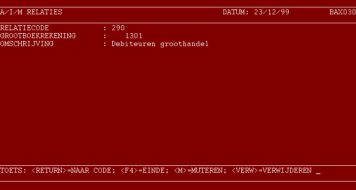TOETS: <RETURN>=NAAR CODE; <F4>=EINDE; <M>=MUTEREN; <VERW>=VERWIJDERENMet <RETURN> keert u terug naar de ingave van een relatiecode, met de <F4>-toets gaat u terug naar het programmamenu.