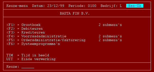 U kunt vanuit alle menu's elk gewenst programma starten door bij 'Keuze:' het betreffende programmanummer in te tikken. Na ingave en bevestiging met <RETURN> van het gewenste nummer verschijnt onderin het menu de omschrijving van het gekozen programma. Door hier nogmaals <RETURN> te geven start u dat programma. Indien u hier <F4> geeft keert u terug naar programmakeuze.